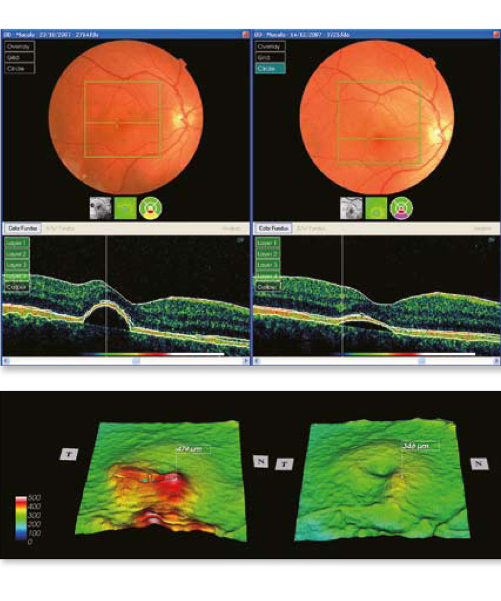 Tomografia retiniană arată în detaliu straturile retinei centrale și astfel sunt vizibile și cele mai fine modificări.
